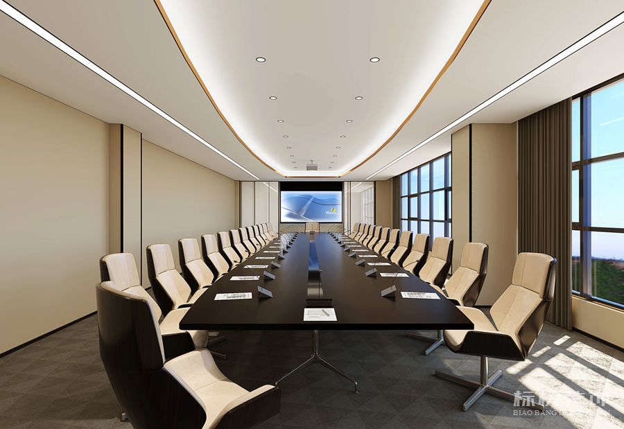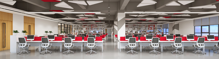 开放式办公室的空间灵活多变,便于后期部门调整和工位 安排。办公室和会议室通常为钢化玻璃做的透明隔断,与办公区隔而不断,融为一个整体。